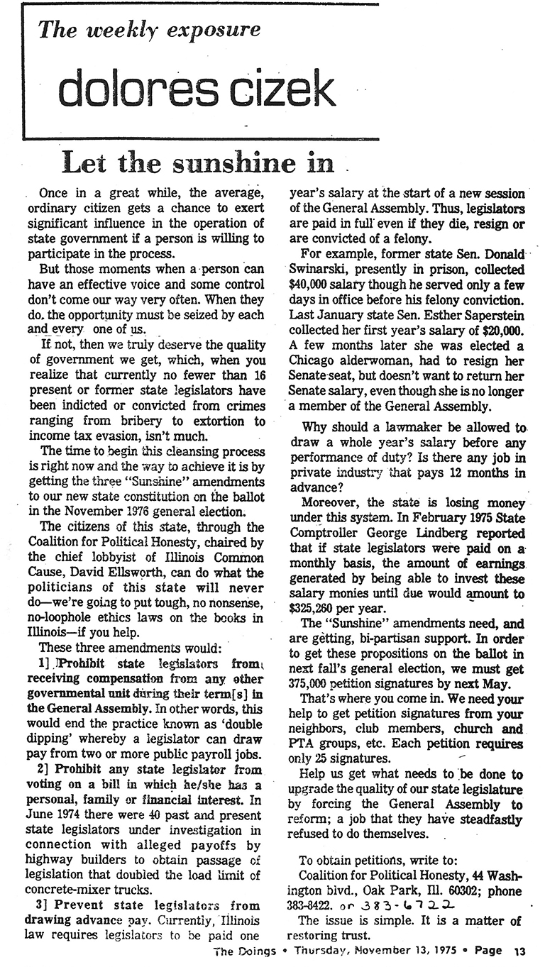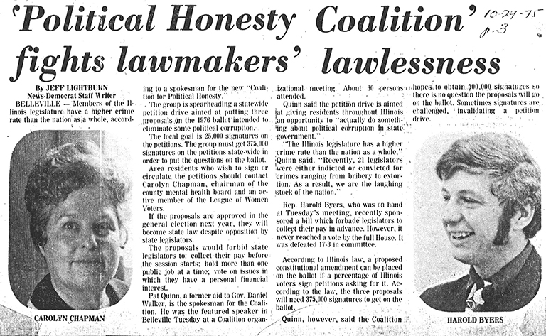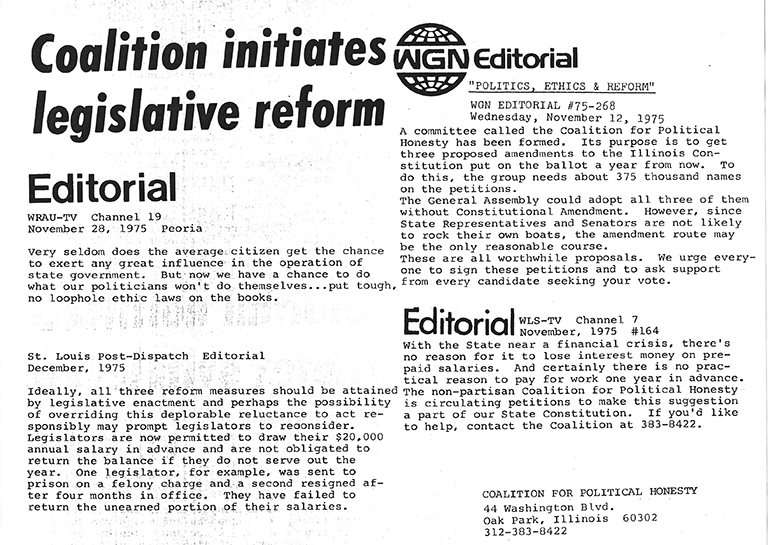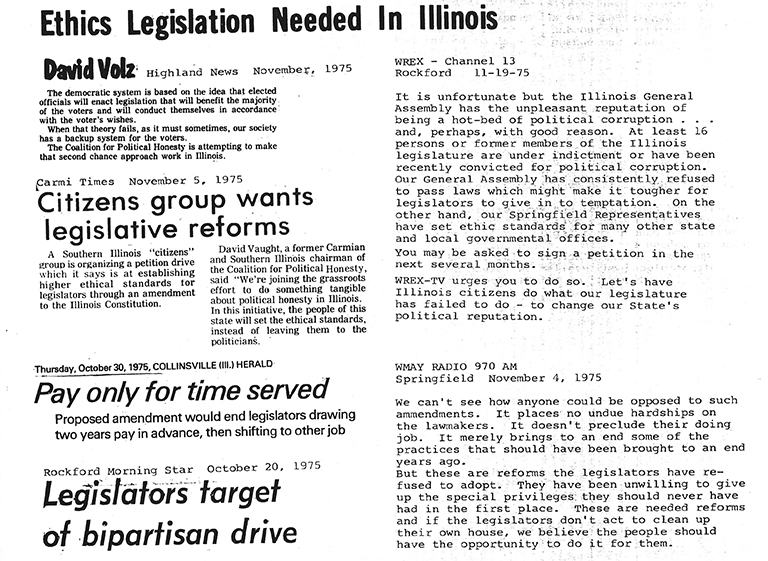 The state law which finally stopped advance pay for legislators was made possible by the Coalition for Political Honesty which organized the largest petition drive in Illinois history.