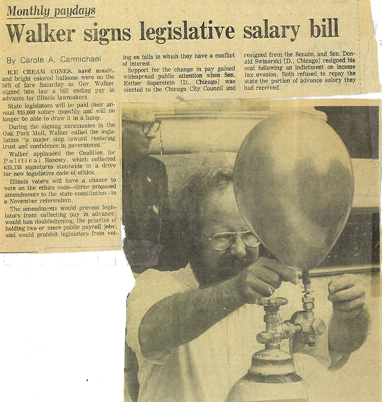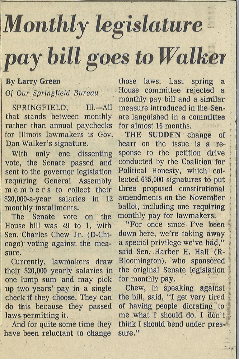 On July 31, 1976, Gov. Dan Walker signed legislation (Public Act 79-1333) ending Illinois’ century-old practice which allowed state legislators to receive their entire annual salary on their first day in office. Under previous Illinois law, even if an Illinois legislator died, resigned, or went to jail, the legislator was allowed to keep a whole year’s paycheck collected on the day of being sworn in.