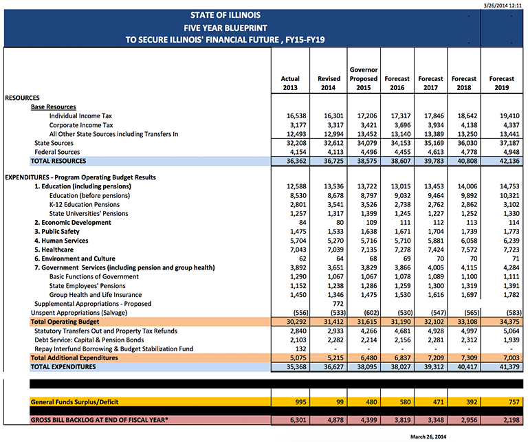 In his 2014 Budget Address, Gov. Quinn proposed this five year blueprint (2015 to 2019) to secure Illinois’ finances for the long term: