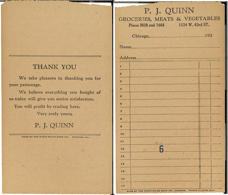 His paternal grandfather, also named Patrick Quinn, had a stint as a Montana copper miner, then came to Chicago’s South Side. In 1915, he opened “Quinn’s Groceries, Meats & Vegetables” at 1124 W. 63rd St., which is now a vacant lot at the northeast corner of May and 63rd St. His motto was “Quinn for Quality, Quantity and Service”.