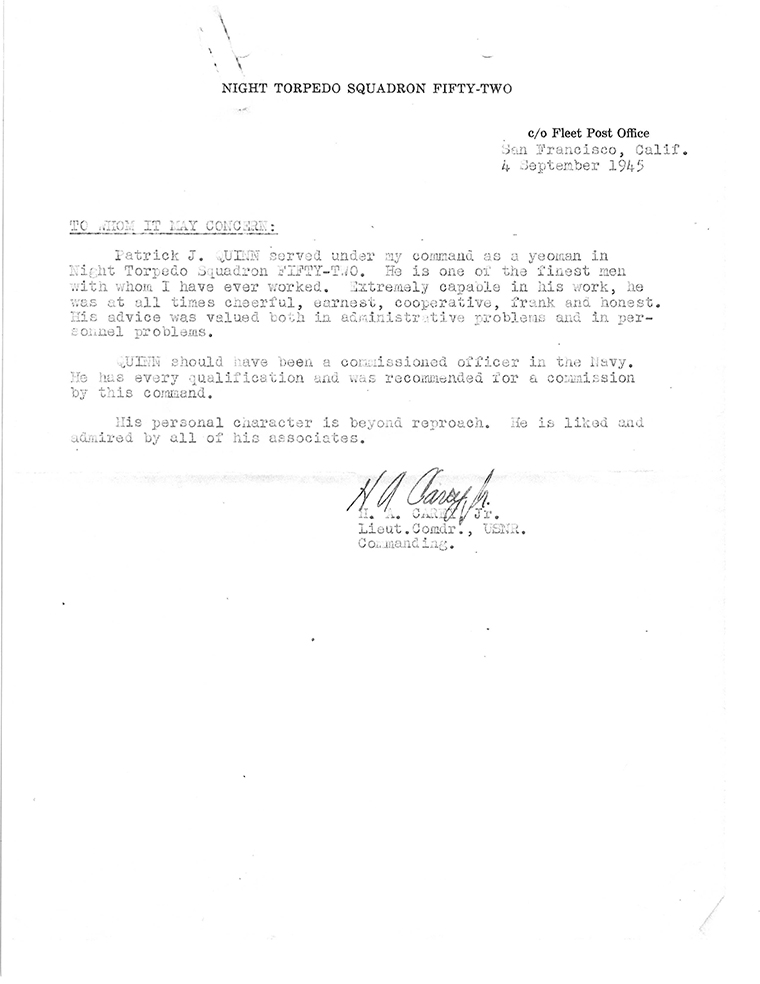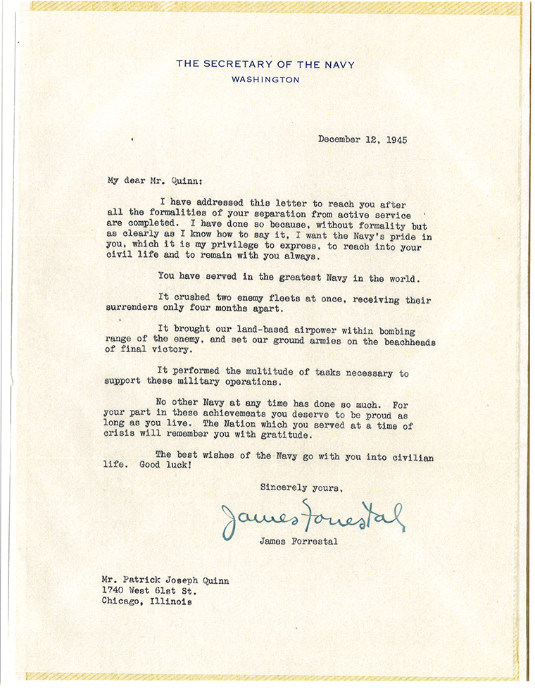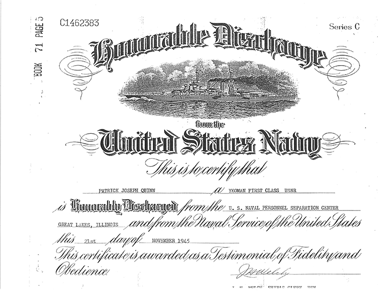 P. J. Quinn enlisted in the U.S. Navy at the outbreak of World War II, serving in the Pacific Theater aboard the USS Bon Homme Richard. He served for three years, one month, and 15 days. In a commendation letter from his commanding officer, Quinn is described as “one of the finest men with whom I have ever worked. Extremely capable in his work, he was at all times cheerful, earnest, cooperative, frank, and honest.”