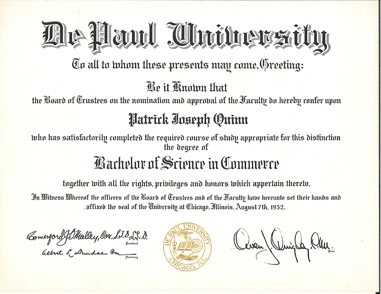 Upon his return home, P. J. Quinn attended and graduated from DePaul University at night thanks to the G.I. Bill of Rights. After World War II, P. J. Quinn worked for decades for the Catholic Cemeteries of the Archdiocese of Chicago as a sexton and personnel director.