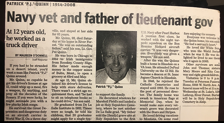 P. J. and Eileen Quinn raised three sons (Pat, Tom, and John) in a single-family home in Hinsdale, Illinois, thanks to a mortgage secured by the Veterans Administration. Eileen worked for decades as an assistant to the principal of the Hinsdale Public Middle School. Both P. J. and Eileen Quinn always played energetic roles in their son Pat’s petition and referendum drives and political campaigns. Eileen had the good fortune of meeting Presidents Barack Obama and Bill Clinton and Vice President Joe Biden.