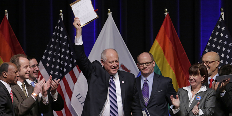 On November 20, 2013, Gov. Pat Quinn signed historic legislation (Public Act 98-597) making marriage equality the law of Illinois. The new law enabled all couples to have access to the same rights, responsibilities, benefits, and protections of civil marriage. It further protected the religious freedom of churches, mosques, synagogues, temples, and other religious organizations.