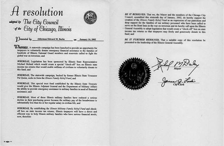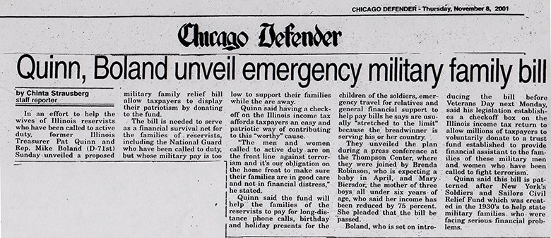 On February 7, 2003, Gov. Rod Blagojevich signed the Illinois Military Family Relief Act (Public Act 92-886) to provide financial help to the families of Illinois National Guard members and reservists who were called to active duty after the terrorist attacks on America on September 11, 2001.
