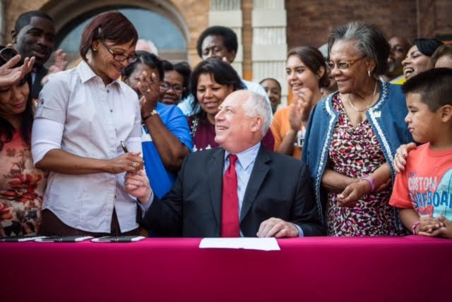 The minimum wage referendum legislation was signed in the Pilsen neighborhood of Chicago. Pictured in the portrait are John Austin of the Chicago Coalition for the Homeless; Gilda Brown of SEIU Healthcare; Jason Coleman of the Chicago Coalition for the Homeless; Gloria Davis of the Chicago Coalition for the Homeless; Anthony Edwards of Action Now; Jeanette Estrada of the Brighton Park Neighborhood Council; Rep. Marcus C. Evans, Jr.; Ald. Toni Foulkes; Keith Kelleher of SEIU Healthcare Illinois; Alma Silva of the Resurrection Project; Antonia Terrones of the Resurrection Project; Alberta Walker of SEIU Healthcare Illinois; and Gloria Warner, the President of Action Now.