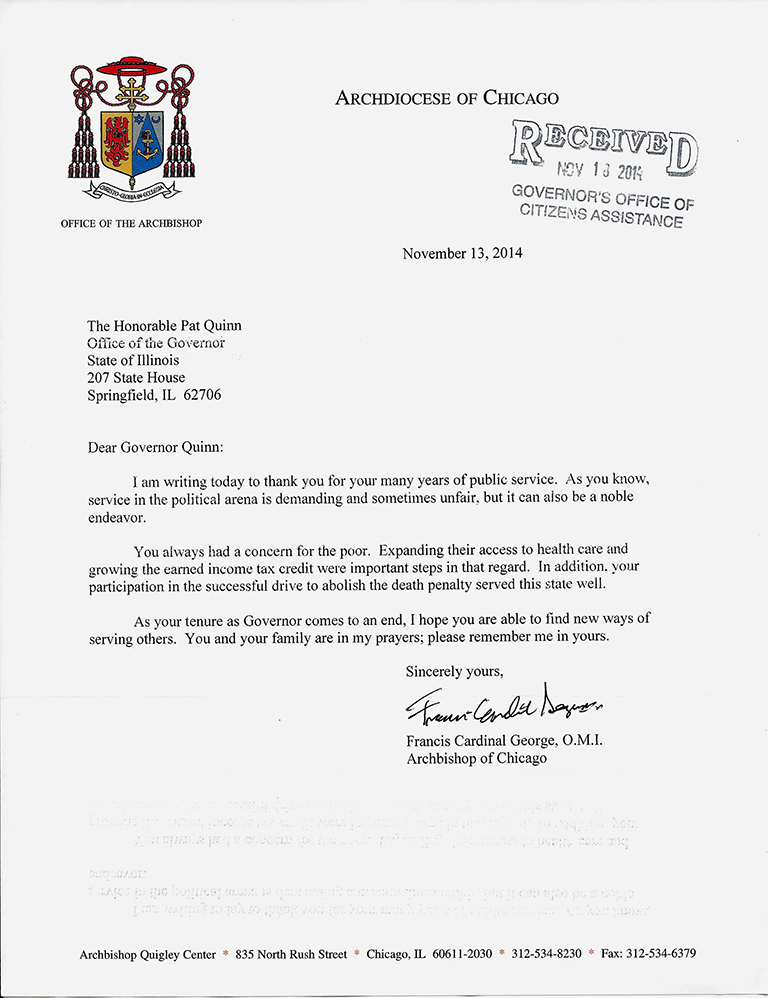 In his speech to the people of Illinois that historic day, Gov. Quinn described the ethic of service he inherited from his parents. As a model for his public service, Quinn invoked the memory of his late father who had served in the U. S. Navy and who had been described by his commanding officer in World War II as follows: