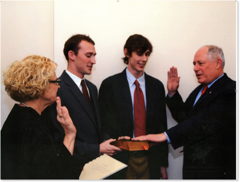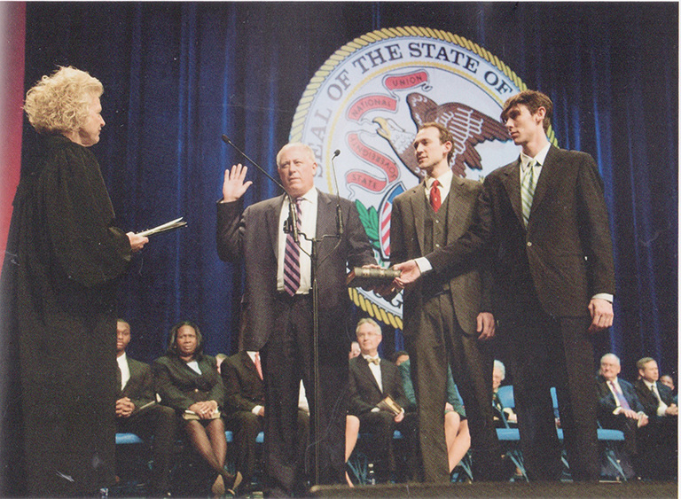 In this photo, Quinn is joined by his sons Patrick and David and Illinois Supreme Court Justice Anne Burke as she administers the official oath of office in the Lieutenant Governor’s Office in the State Capitol.