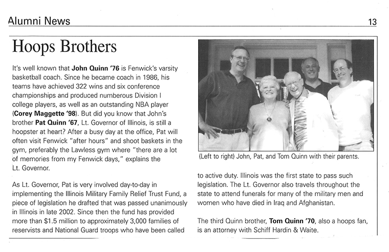 John Quinn has been an American history teacher at Fenwick High School (Oak Park) since 1980 and is an Illinois Hall of Fame basketball coach. He has also received the Golden Apple Award for Excellence in Teaching. John is married to Anne Cusick and they have three daughters: Charlotte, Maria, and Catherine.